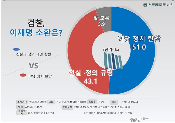 1. 검찰이 이재명 더불어 민주당 대표를 출석 통보는? ‘정치 탄압’ 51.0%, ‘진실과 정의를 규명하는 수사절차’ 43.1%