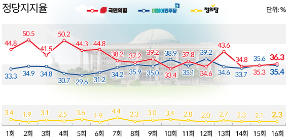 2. 정당 지지율 : 국민의 힘은 36.3%(1.0%↑), 민주당 35.4%(1.9%↓) : 국힘 위기감 고조, 보수층 결집