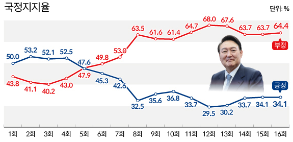 1. 윤 대통령 국정운영평가 : 64.4%(0.7%↑), 긍정평가 34.1%(0.0%)