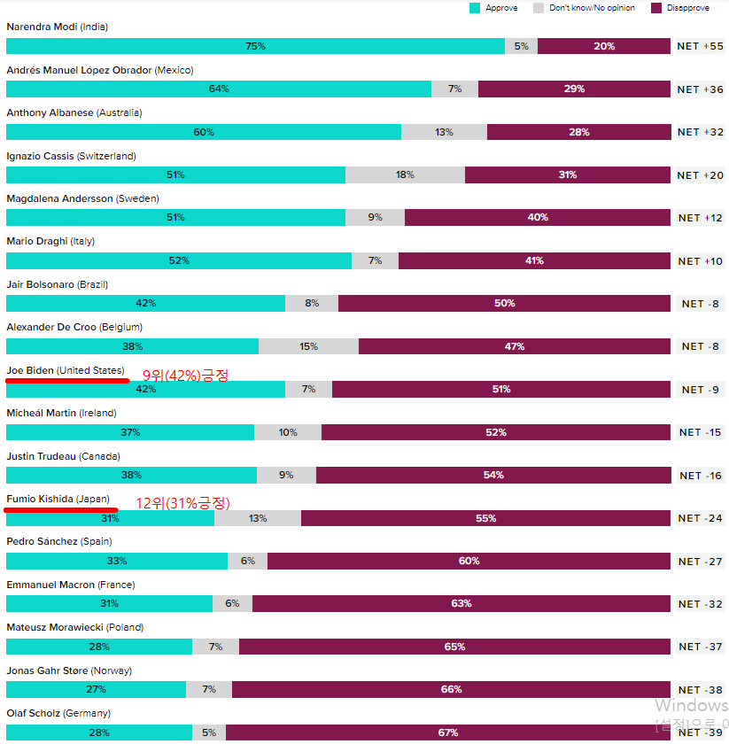 **조 바이든 42%(9위), 기시다 31%(12위)