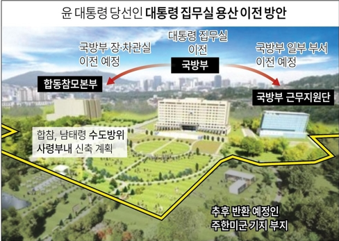 | 대통령집무실 이전비용 | 496억원(3월 발표) (국방부청사에서 집무실로 리모델링253억원+경호처이사비용99억원+기존입주기관(국방부/합참)건물이전비118억원+공관리모델링비25억원) |